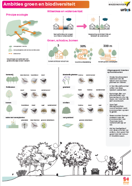 Dit paneel richtte zich op thema’s als klimaatadaptatie, biodiversiteit en energie. Er werd informatie gedeeld over bijvoorbeeld het behoud, verbinden en de uitbreiding van groen, het gebruik van duurzame materialen, en kansen voor regenwateropvang. Op het paneel stonden illustraties zoals vogels en bomen om de plannen visueel te ondersteunen. Voor de meest in het gebied voorkomende vogelsoorten werd aangegeven dat ze een variatie aan beplantingstypen nodig hebben.